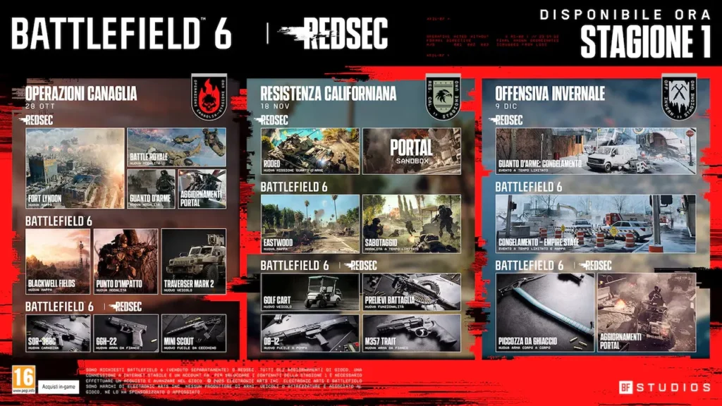 Infine, l’evento a tempo limitato Resistenza Californiana arriverà su Battlefield 6 e sarà disponibile gratuitamente su REDSEC, includendo anche un Tracciato bonus completabile insieme al Pass battaglia della Stagione 1. La fase finale della stagione, Offensiva Invernale, partirà a Dicembre, introducendo contenuti speciali a tema stagionale.