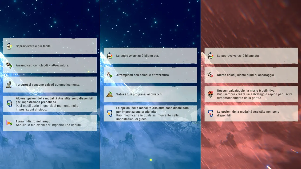 La difficoltà è regolabile e pensata per adattarsi a stili di gioco diversi: sono disponibili tre livelli, che vanno dalla modalità “Esploratore”, più narrativa e assistita, a quella “Alpinista”, più bilanciata, fino alla difficoltà massima, “Free Solo”, senza alcun tipo di aiuto e con morte permanente, consigliata solo agli amanti delle sfide più ardue. Qui le differenze tra i tre livelli.